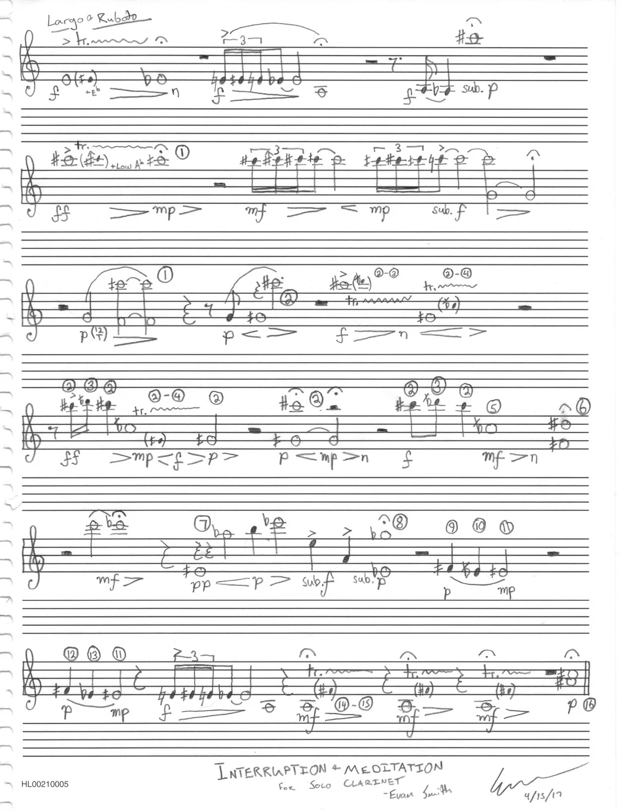 Interruption and Meditation is a work born out of improvisations inspired by the compositions of William O. Smith. The impetus for some of the multiphonics and timbral variations are derived from the first movement of Smith’s Variants for Solo Clarinet. This movement, entitled “Singing,” is simply two lines, and threads multiphonics alongside single pitches and trills. I aimed to also commit to short, concise melodies to further highlight the subtle changes in texture and pitch brought forth by the sixteen “non-traditional” fingerings included within the composition. Working more on saxophone, I also wanted to explore the clarinet’s potential for disjunct dyad multiphonics brought forth from the instrument’s missing harmonic partials. The piece was written over the span of one afternoon as a series of improvisations that were interrupted by various daily tasks. I then tasked myself with creating order from my improvisations, making musical decisions, and notating and recording a final version of my explorations.